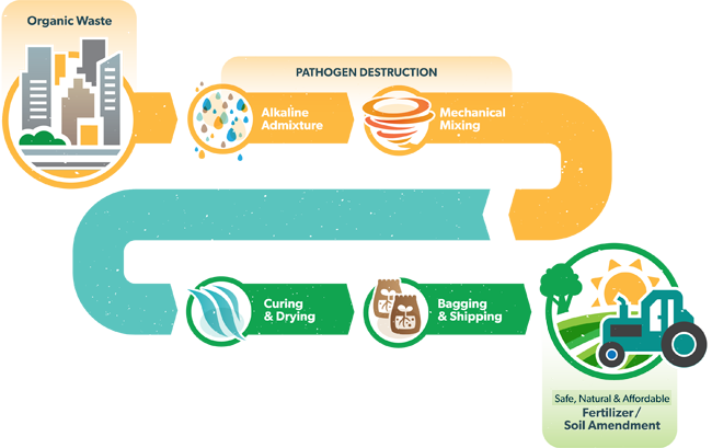 In this version of our technology, we mix the raw materials once to raise the pH and temperature of the inbound organic waste to deliver the pathogen elimination that is a key feature of our final product. Then after a 12 hour “cure” period, the mixed material is ready for bagging and shipping. As a sub version of this product, we can use a rotary drum dryer to further condition and dry the final product prior to shipping.